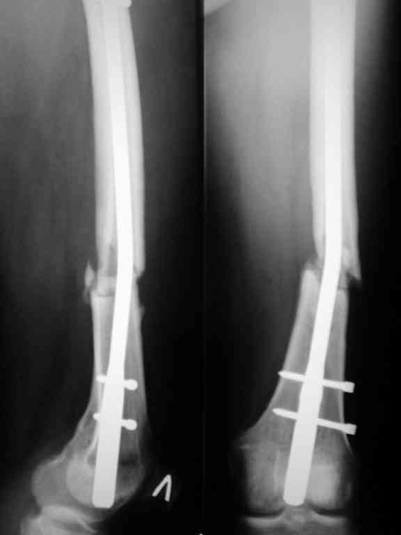 2. "судя по рентгенограммам старались вы на совесть, когда открывали область перелома при интрамедуллярном остеосинтезе"