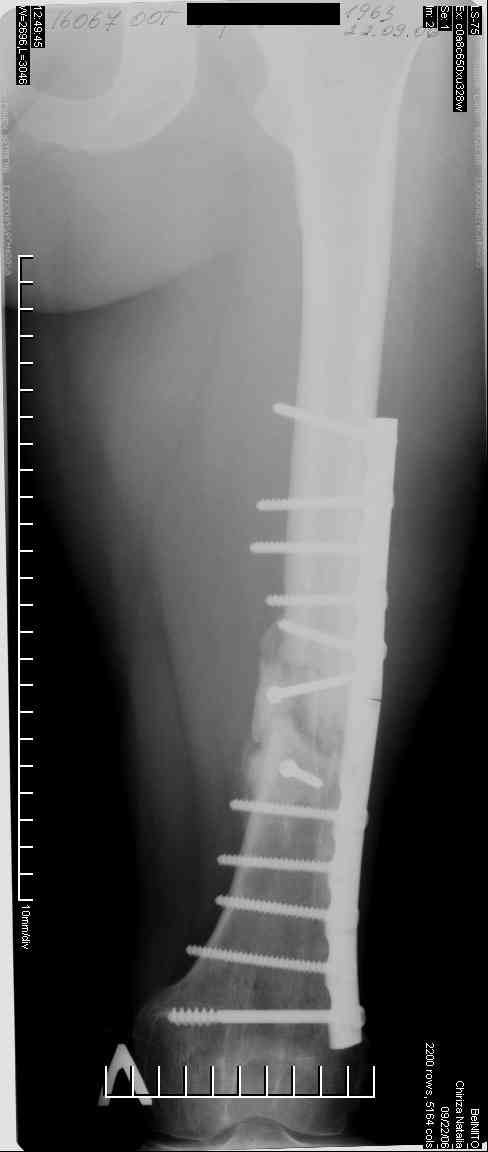 Соматически здорова. В ноябре 2004 года падение с высоты 12 м, перелом правой вертлужной впадины со смещением, неврит седалищного нерва, откр. перелом дистального отдела большеберцовой кости справа и закрытый перелом с/н/3 левого бедра. К нам поступила через 3 недели после травмы, был выполнен в 2 сессии сначала интрамедуллярный ретроградный остеосинтез бедра слева, затем остеосинтез вертлужной впадины и голеностопа справа. При остеосинтезе бедра пришлось немного приоткрыться в зоне перелома для репозиции и вообще операция затянулась часа на 2.5-3 (это один из наших первых интрамедуллярных синтезов). Через 4 месяца при нагрузке весом около 50 кг постепенно развилась варусная деформация бедра с искривлением стержня. Закрыто выпрямили под наркозом, динамизация гвоздя,но в сентябре 2005 г. согнулось бедро снова. Гвоздь удалили, остеосинтез пластиной, декортикация, пластика спонгиозой из метафиза б/берцовой кости. Динамика заживления вялая, но конструкция стояла неплохо (без признаков расшатывания), постепенно дали нагрузку - в марте 2006 года - перелом пластины - реостеосинтез пластиной, пластика гребнем подвздошной кости. На контролях (за август, т.е. 4 мес. после операции - прилагаю) динамика положительная, разрешена нагрузка до 50 кг. В начале этой недели без падения вновь появились боли в бедре - на Р-граммах - перелом пластины (снимки прилагаю).