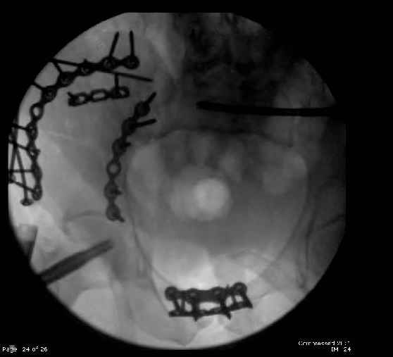 Then 6-hole plate along brim with 1 screw in R sacral ala. Then lagged 2 screws along crest A --> P. finally 10-hole plate along inner aspect of crest. R posterior ilium still a bit stepped off.