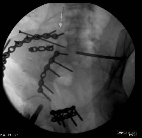 Then 6-hole plate along brim with 1 screw in R sacral ala. Then lagged 2 screws along crest A --> P. finally 10-hole plate along inner aspect of crest. R posterior ilium still a bit stepped off.