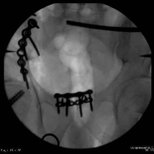 Finally, the L SI joint seemed wide, even after closing it with c-clamp and iliosacral screw, so I added the extra 4 hole symphyseal plate anteriorly (even though to my knowledge unproven). That was the thinking and sequence of events that lead to the 2 symph plates shown. Note that the 4 hole recon is a locking plate (non-locked in medial 2 holes before locked screws in holes 1 & 4) -- fertile ground for debate on that I'm sure!