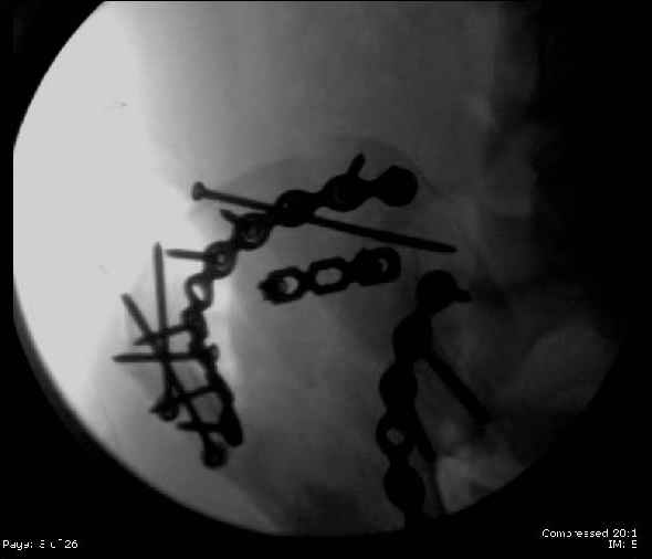 Applied second plate anteriorly on symphysis as I wasn't confident L SI was as stable as it could be and wanted to protect it better.