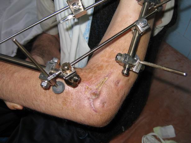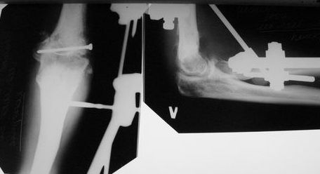 Прошло 3 месяца. Удалил весь металл. Патологической подвижности нет. Свищей нет. Отека нет. Выписал из отделения через 10 дней после удаления. Теперь проблема в разработке движений. Пока объем около 10 градусов (сгибание-разгибание). Не уверен в настойчивости пациента в стремлении добиться максимально возможного эффекта, его волнует вопрос об инвалидности гораздо больше.