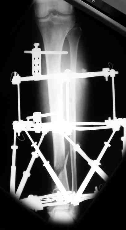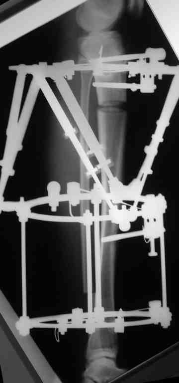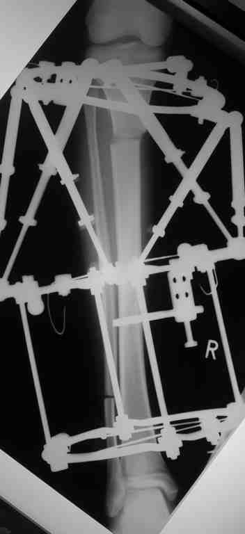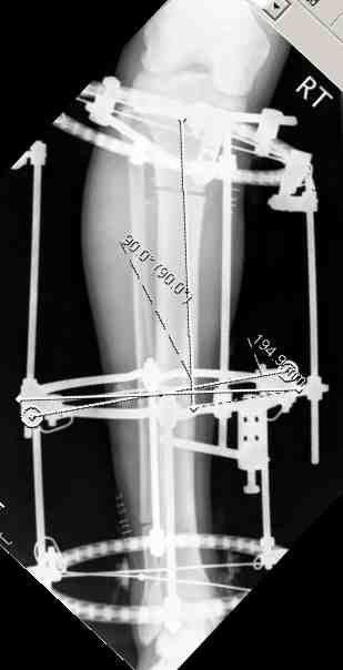 Выше приведены рентгенограммы 13-летнего подростка, страдающего от огнестрельного многооскольчатого перелома дистальной трети бедра. AO наружный фиксатор наложенный в день травмы не дал приемлемой редукции. Через три недели после перелома аппарат Илизарова был наложен без попытки одномоментной репозиции на операционном столе.