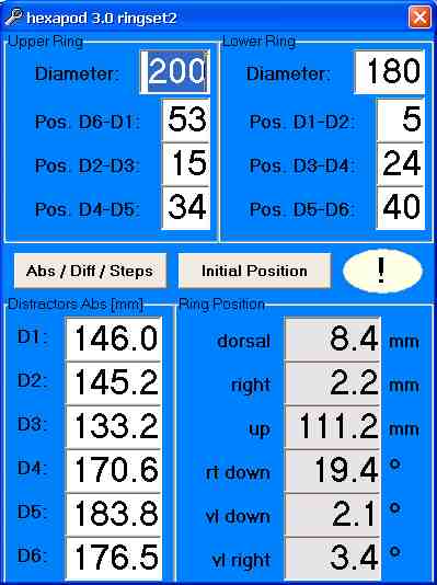 The software is very simple to use and does not need any connection to the Internet. The base data needed includes the diameter of the upper and lower rings, the positions of the Y adaptors on each ring and the length of the distraction rods. After the input of this data into the computer, the program shows the initial position of center of the upper ring in relation to the lower.