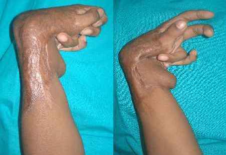 из Dear all 11 yr old boy. Post traumatic wrist flexion contracture of 90 degrees and stfiif little and ring finges but other fingers mobile. Poor dorsal skin.