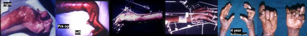Etiology: Post burns contractures of the hands and the wrists Time elapsed since episode: 9 months In frame time: 7 weeks follow up after 4 years (his son had a compound supracondylar femoral fracture and he brought him to us for treatment from approximately 1600 kms away!)
