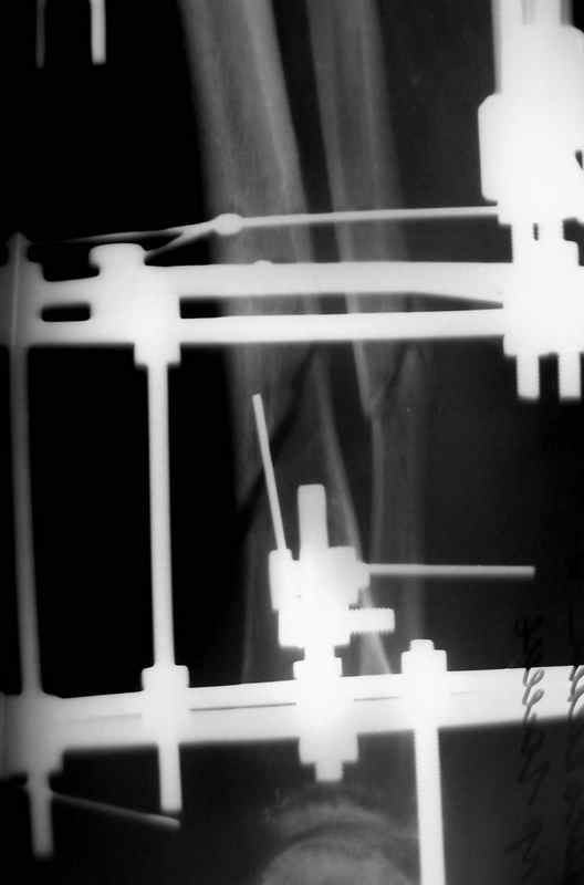 Контакт отломков только по спирали наружной стенки,заживление раны полное, на 3-4 месяце ЧКДО воздействие на регенерацию микродистрациями , 5 месяц снят аппарат по причине нестабильности и реакции м/тканей. В данный момент проблем с тканями нет, на Р-граммах псевдоартроз, клинически подвижность,больная ходит в ортезе с дозированной нагрузкой.Местно рубцовый процесс 3х5 в зоне перелома.