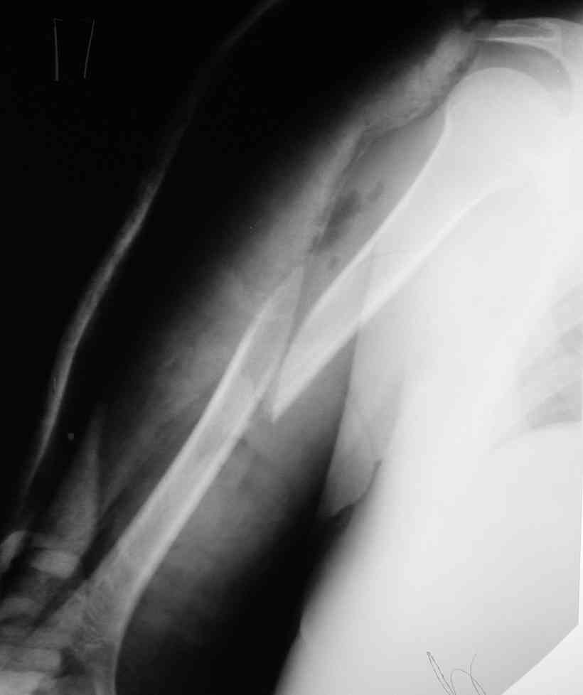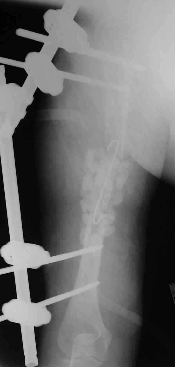 Через 2 недели интрамедуллярный остеосинтез с замещением дефекта кости цилиндрическим металлокаркасом (А.Ф. Лазарев подарил). Дренажи удалили, раны зажили, свищи закрылись. В конце августа благополучно выписана с движениями в локтевом суставе в объеме 0-10-100 град. в плечевом - отведение 45, сгибание -60 (стакан поднять могла). 27.11 в состоянии не прекращающегося после выписки опьянения получила закрытый надмыщелковый перелом плеча на уровне дистальных блокирующих винтов в результате адекватной травмы. Снимки прилагаются. Коллеги, как бы Вы лечили такой перелом, не принимая во внимание социальный статус и "безграничные" материальные возможности пациентки. Жду советов, комментариев и критики. А.Семенистый.