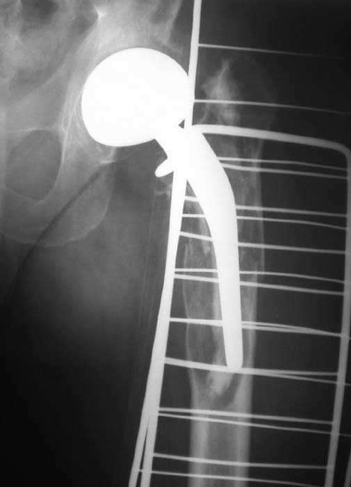 через перелом с удалением самой ножки, костного цемента и рубцовых тканей. Установка ножки дистальной фиксации (типа Solution), длину ножки