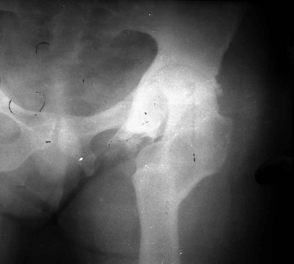 Почти 2 г назад низведение головки бедра проводилось в условиях аппарата Илизарова таз-бедро , затем проводилась отрытая репозиция головки бедра с межвертельной укорачивающей остеотомией. Признака некроза головки были видны интраоперационно (дефект хрящевого слоя, тусклый цвет), а рентгенологические признаки появились через 1-2 мес.