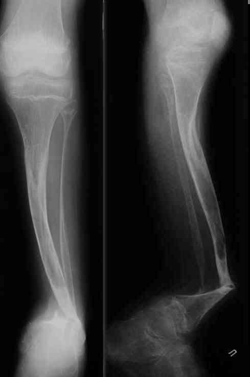 Уважаемые коллеги! В отделении на лечении наблюдается пациент 16 лет с диагнозом: Псевдоартроз костей левой голенив нижней трети. Вальгусная деформация обоих коленных суставов. Укорочение левой н/конечности11см. С 1997 года состоит на учёте у онколога с диагнозом: Рабдомиосаркома мышц тазового дна IV ст., с метастазами в метафизы берцовых костей.Проведена полихимиотерапия, лучевая терапия. В 1998 г. удаление опухоли. Послеоперационный период без особенностей. С 1998 года со стороны онкологии ремиссия, перестройка очагов метастазирования в берцовых костях по типу фиброзной дисплазии.В 1999 г. патологический перелом костей левой голени в н/трети. Лечение в гипсе 1.5 месяца, затем компрессионно-дистракционный остеосинтез апп. Илизарова. Сращения на месте псевдоартроза не достигнуто. С 1999г. ходит без нагрузки на левую н/конечность. Выраженный остеопороз костей н/конечностей. 17.11.05. Операция: Костная пластика зоны псевдоартроза левой б/берцовой кости по типу "русский замок", остеосинтез пластинкой и винтами. После начала нагрузки на конечность рецидив деформации, миграция фиксаторов. 05.12.06. Операция: Удаление фиксаторов из левой голени. Шарнирная остеотомия трети левой б/берцовой кости, остеотомия м/берцовой кости. Дистракционный остеосинтез апп. Илизарова. Устранены основные виды деформации б/берцовой кости. Планировали в дальнейшем несвободную костную аутопластику и интрамедуллярный остеосинтез с блокированием, но кость очень тонкая, склерозированная, выраженный остеопороз. Возникают большие сомнения о возможности сращения даже при этих условиях. Будем рады услышать ваши мнения по дальнейшему лечению данного пациента. Екатериан Анатольевна Озерова, детское отделение УНИИТО