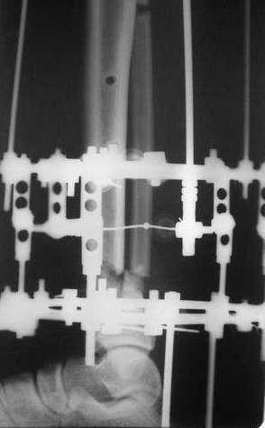 3,4 - через 4 недели наложен спице-стержневой аппарат, произведена остеотомия большеберцовой кости в верхней трети, раны зажили, проводилась дистракция в аппарате.