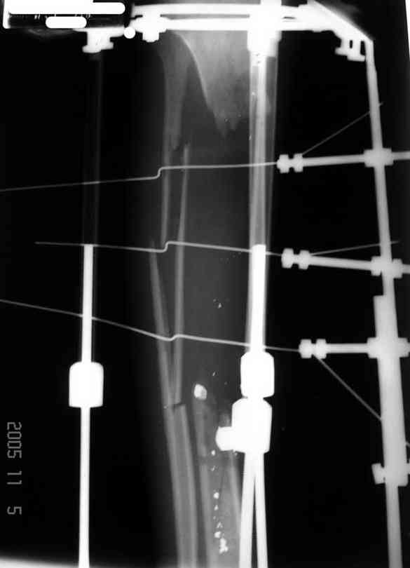 При правильно смонтированном аппарате после уверенности в жизнеспособности конечности - остеотомия большеберцовой кости в верхней трети и коррекция длины дистракцией. Сейчас же реализации этой методики мешает малоберцовая кость. Да и с "сосулькой" тоже особенно не разгуляешься в рубцах.