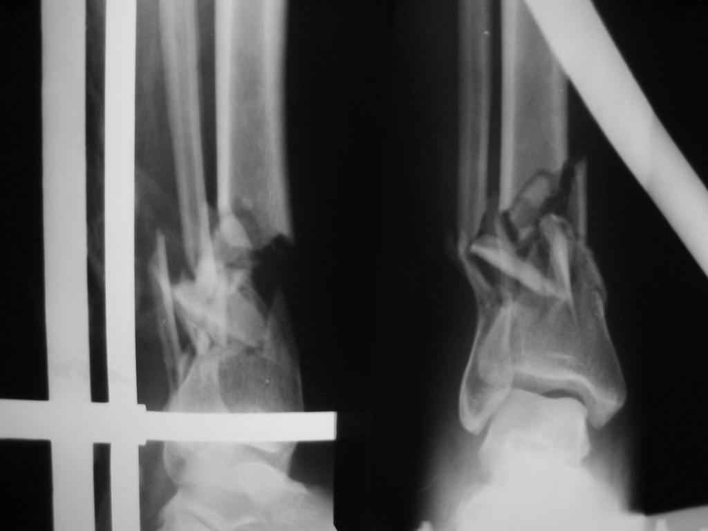 Открытый перелом (1А Каплан)у женщины 39 лет - падение плиты на голень.