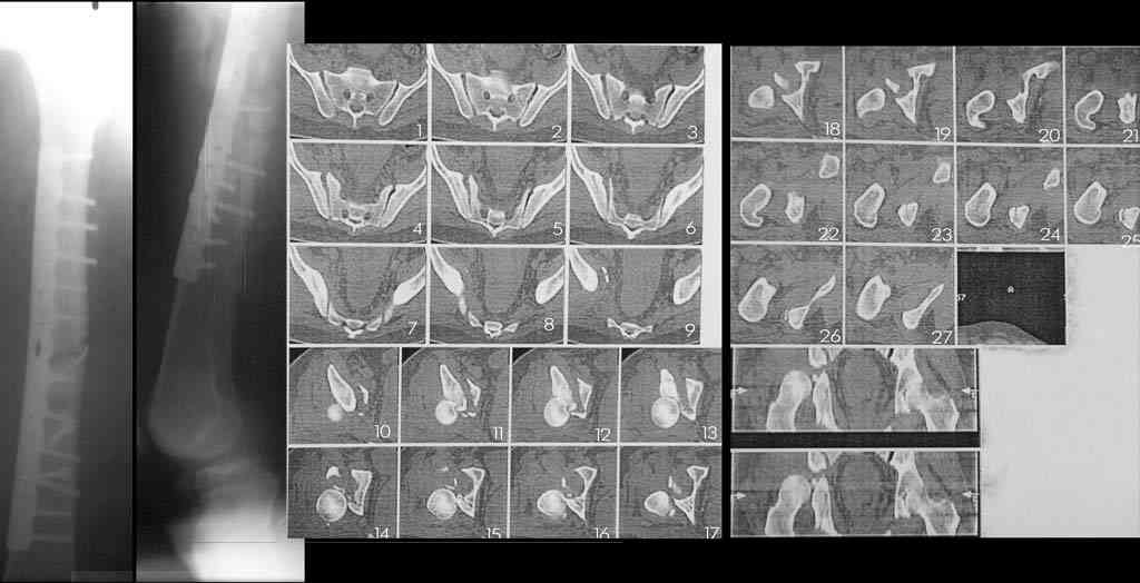 Вопрос, конечно, касается в первую очередь перелома впадины и вывиха бедра. Конкретно: стоит ли вывих пытаться открыто вправлять при такой давности травмы и сопутствующих повреждениях. Кроме того, для эндопротезирования определённую проблему создаст накостный фиксатор, расположенный вплоть до верхней трети диафиза, а на бысрое и беспроблемное сращение там расчитывать не стоит наверняка.