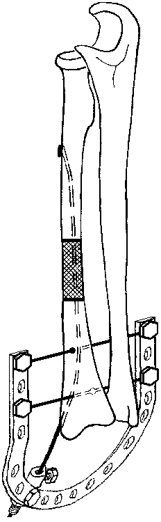 В подобном случае мы бы заместили дефект лучевой кости аутотрансплантатом из крыла подвздошной кости, при дефекте свыше 4-5 см - несвободным, с фиксацией способом КНО (комб.напряженный остеосинтез) или используя блокируемый остеосинтез. Вместо представленной на рис. опоры может быть использована монолатеральная на основе 2-х 4 мм стержней-шурупов
