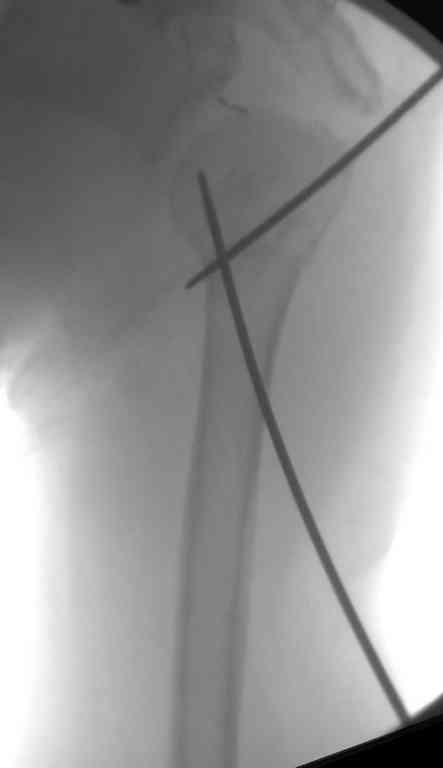 Почему не из диафиза в головку? Тогда не будет препятствий для движений в плечевом суставе.