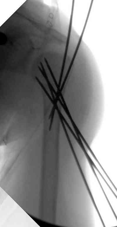 пример из нашей практики, вроде обычный перелом шейки, фиксированный популярным методом "Сиэтла" - множественными спицами 2.8 мм с резьбой на конце.