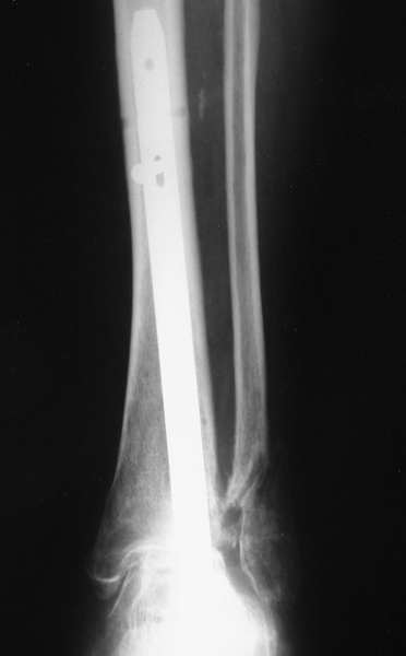 Можно: 65-летняя пациентка, оперирована по поводу несросшегося в гипсе перелома лодыжек с патологической вальгусной установкой стопы и выраженным нарушением опрной функции. Оперирована через 6 месяцев после травмы. Рентгенограммы через 4 месяца после операции.