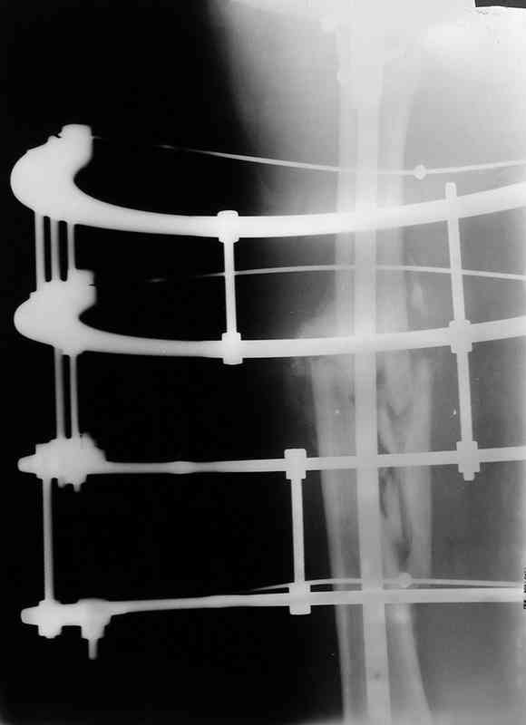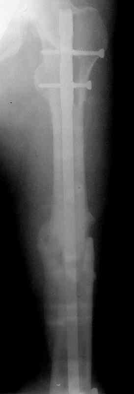 Фиксаторы удалены через 12 месяцев после операции, выполненной по поводу замедленной консолидации перелома бедра с его укорочением.