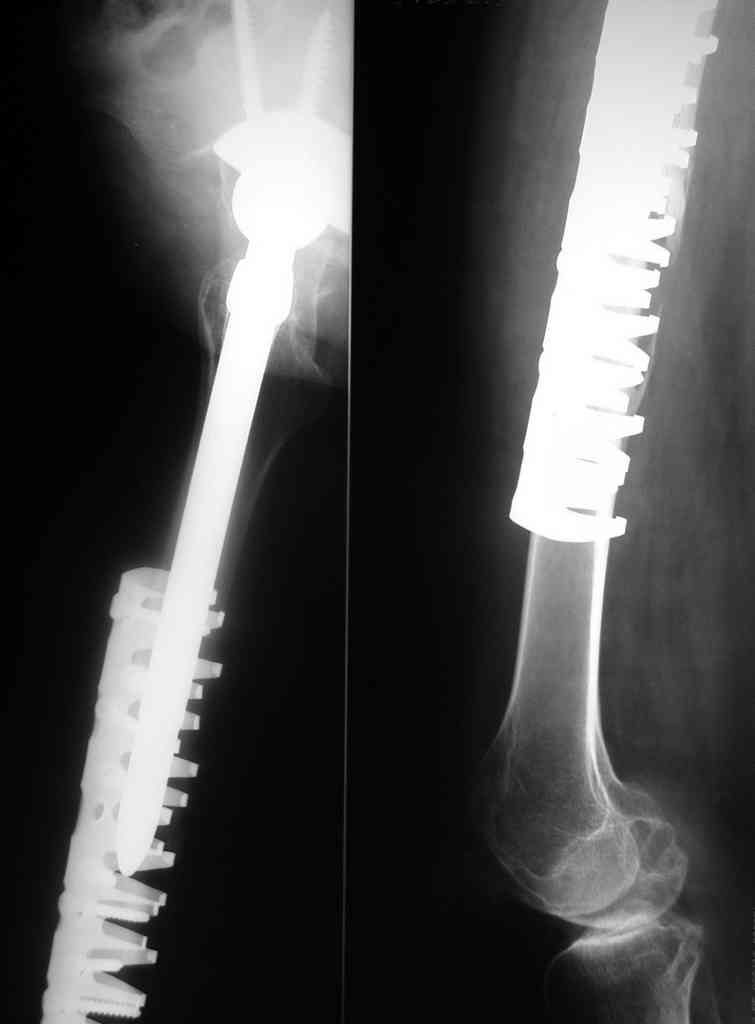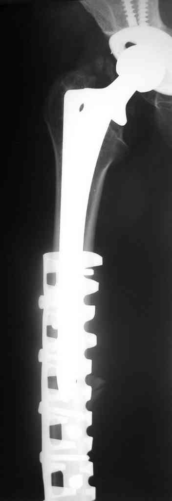 В данном случае можно порекомендовать обычную блокированную пластину для накостного остеосинтеза бедра. Над проекцией ножки протеза лучше всего использовать специалаьные перипротезные блокированные винты, длиной 12-18 мм, в зависимости от толщины кортикального слоя. Если толщина кортикала недостаточна и возникает конфликт винт-ножка протеза, то вместо винтов в отверстие пластины можно установить специальный держатель серкляжа, через который проводится проволока.