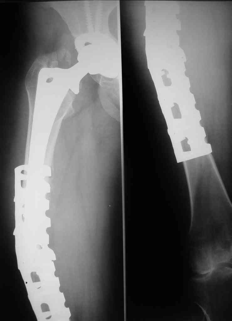 У нас нет опыта использованияподобных конструкций, но выглядит она очень внушительно, представляю что творится с питанием костной ткани - внутрикостно ножка АМЛ, да еще циркулярно металлическая пластина... Я бы убрал эту конструкцию, а взамен использовал пластину с подготовленными запилами для серкляжного шва (такая есть фирменная, но думаю что очень дорогая). Проблема заключается в фиксации проксимального отдела, в идеале - провести винты тангенциально к ножке на уровне ее средней трети. Если это не удастся, либо фиксация будет недостаточной, то выполнить фиксацию серкляжом с обязательным обкладыванием бедренной