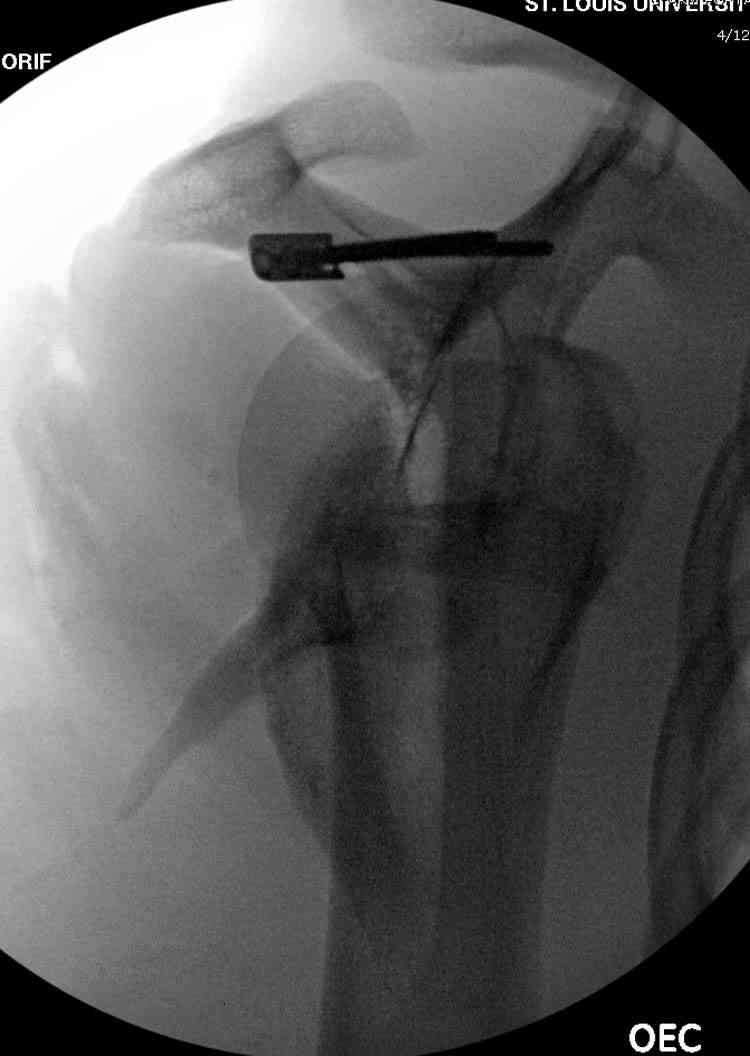 Передним дельтопекторальным Bankart доступом намного легче провести фиксация отростка, но тогда репозиция и фиксация колонн затрудняется, поэтому был применен стандартный Judet задний доступ.