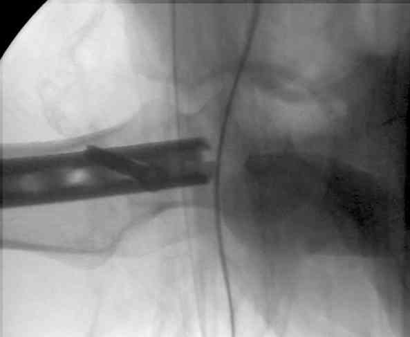 Костная масса, полученная в результате рассверливания канала, кстати, прекрасный пластический материал, можно использовать для лечения ложного сустава. Через любую трубку небольшого диаметра, без открытия фокуса, можно уложить на место дефекта. Блокирующие шурупы в 6.5 и 5.0 мм диаметра, и больной смело может передвигаться, потому что 12 мм штифт с одним дистальным и проксимальным блокирующими шурупами выдерживает вес в 75 кг.