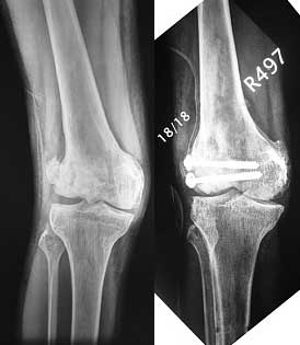 This was fixed temporarily, bone grafted with tricortical struts, and fixed by two cancellous screws. The fragment was not large enough to afford any fixation to a plate or such implant, and the screws held it compressed well to the rest of the distal femur.