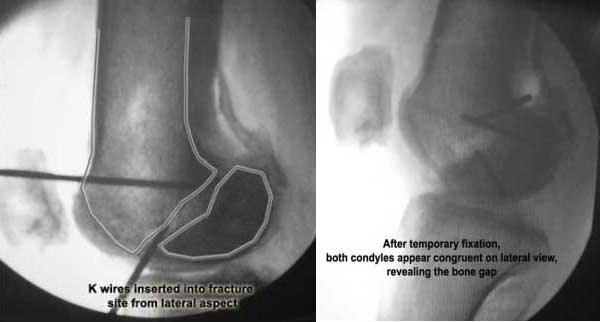 This brought the lateral condylar fragment into a position that seemed to be reasonably well aligned, but showed up a bone gap.