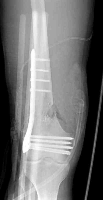 Supracondilar femoral reconstruction nail (we use MDN supracondiltar nail from Zimmer) and bone graft.