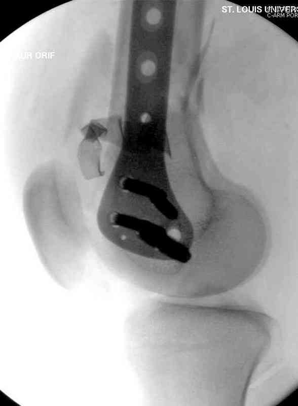 Предпочтительно фиксацию провести пластинами, во-первых, можно было сделать квадрицепс-пластику по Judet для восстановления движения в суставе, а потом коррекцию и фиксацию кондилярной пластиной с угловой стабильностью. Стерильный турникет на конечность поможет уменьшить кровепотерю во время операции.