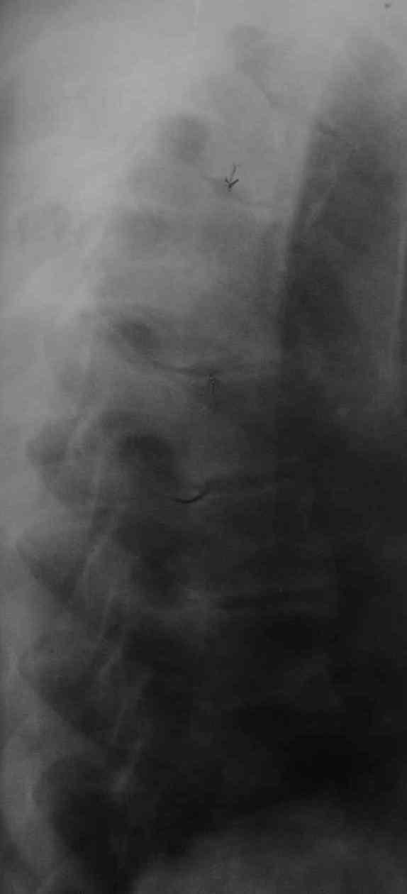 Больной 1949 г.р. поступил в отд. неврологии 3.03.07 г с д-зом: Остеохондроз грудного отдела позвоночника. При поступлении предъявлял сильные боли в грудном отделе позвоночника. Распространенным остеохондрозом позвоночника страдает несколько лет, неоднократно лечился у невропатолога поликлиники. Состояние ухудшилось в конце февраля после физической нагрузки. В марте 2005 г. лечился в х\о по поводу нагноившейся атеромы спины. При поступлении - ограничение движений в грудном отделе позвоночника, кифоз, болезненность при пальпации паравертебральных точек спины, симптомы D=S, парезов не отмечалось. При поступлении общеклинические и биохимические анализы крови и мочи. Все в пределах нормы. Можно отметить только L- 9,9 тыс. Назначенное рутинное лечение остеохондроза с включением НПВС было без эффекта. На фоне нарастающего болевого синдрома, 15. 03.07 г наступила нижняя параплегия, нарушение функции тазовых органов по типу острой задержки мочи. Больной переведен в ОРиТ, где были выполнены дополнительные методы обследования: