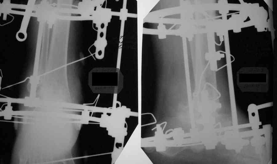 Погрешности мелкие, на исход лечения вряд ли повлияют. Но все же. По-моему не одинаковые кольца, не корректно введенный согнутый стержень Шанца, проксимальные чрескостные элементы расположены на одной опоре (база на голени вполне могла бы быть из двух колец) и совсем мелкие замечания - грубо загнутые не скушенные концы спиц, местами не отмытая скорее всего с момента операции с конечности и аппарата кровь.