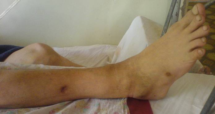 Укорочение конечности 3 см. Передвигался без дополнительной опоры с "нарощенной" подошвой на правой обуви. Ограничение тыльного и подошвенного сгибания - умеренные (всего примерно 50%, не измерял).