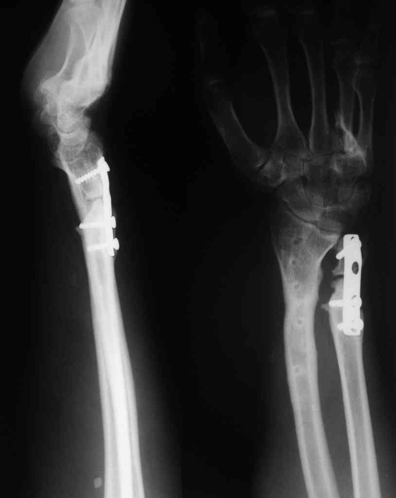 Как вам видится такой вариант: убрать пластину с локтевой кости, выполнить резекцию локтевой вместе с псевдоартрозом, установить протез лучезапястного сустава?