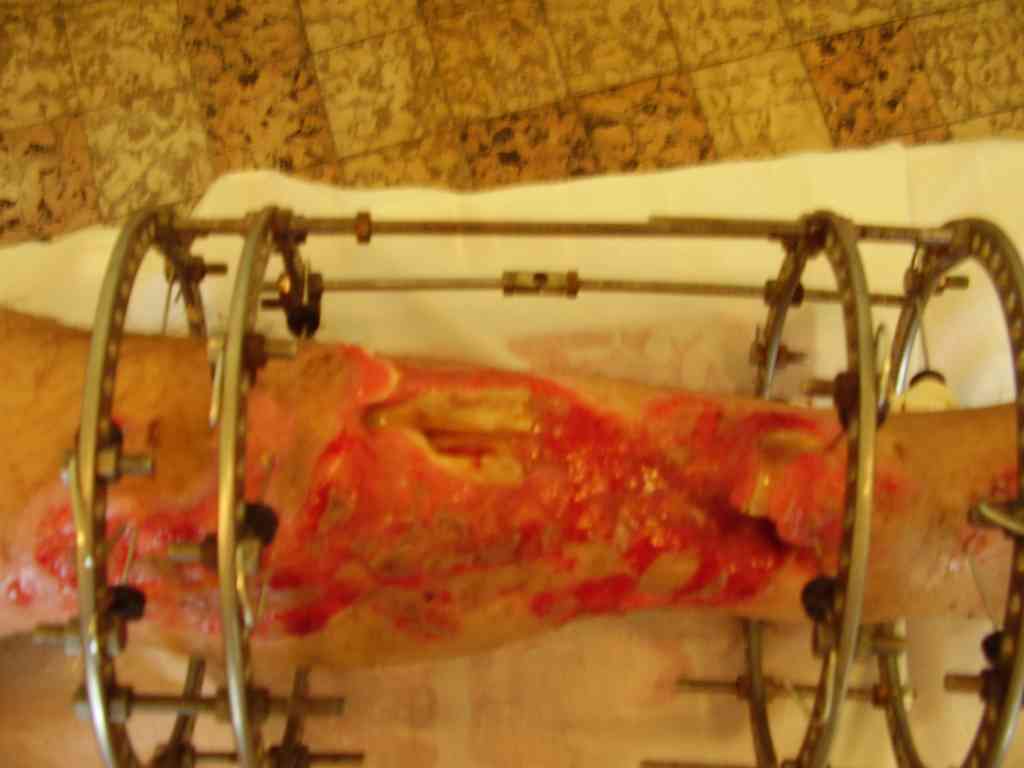 Калохитовая гупка является материалом для заживления раны, она состоит из колагеновых ниток, дает возможность быстрее восстанавливатся мягким тканаям, а перфторан местно применять очень просто, просто перфторан заливается в рану,а через кончик иголку от шприца соединенное через капельницу к кислородному баллону или к подушке заполненная кислородом, и перторан под давлением пропущенным кислородом оксигенируется,там самим оксигенируя ткани, процедуру можно выполнять до очищения некрозов и появления грануляционных тканей. За 2 года у нас было 6 случаев с открытими переломами костей голени с обширным повреждением мягких тканей. а 3 года тому назад был посттравматический остеомиелит бедра после ДТП, удалось купировать остеомиелит и достичь срощения перелома. Прилагаю снимок с переломом костей голени с общирным повреждением мягких тканей