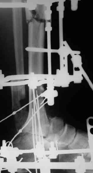 После удостоворения, что остеотомия сделана по предварительному плану, теперь необходимо сделать контрольные снимки голеностопа. При первичной компрессии расширенная внизу вилка голеностопа и плюс мягкие ткани создают мягкотканую "гармошку". В зависимости от размера конечности у некоторых больных возникают трудности ношения обычной обуви после артродеза.