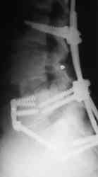 Если позволите, некоторые теоретические соображения по результатам и показаниям. Сегодня все знают как оперировать позвоночник по поводу любых "напастей". Когда после операции боли остаются приходит время вспомнить о том, что морфологический субстрат боли при полисегментарной саногенетической реакции патологического типа, каким является остеохондроз и другие спондилогенные изменения дегенеративно-дистрофического характера, точно установить, как правило, невозможно. Аномалиям развития здесь особенно не повезло. Например, если у пациента протрузии на нескольких уровнях, дегенеративный стеноз и сакрализация - лечат сакрализацию т.к. она "режет глаз" специалисту. Соответственно и эффект от вмешательства на уровне "не навредили". Специальные методы исследования мало что дают в этом плане, а МРТ, вообще, годится только для обоснования необходимости операции при разборе жалобы. Поэтому вначале рекомендую лечебно-диагностические тест-блокады. Если эпидуральная по Катлену через день (результат оценивать после 3-5 блокад) снимает жалобы - оперировать не стоит. Если локальная боль остается - прицельную паравертебральную в зону неоартроза - исчезновение боли показание не к операции, а к повторному курсу через 3-6 мес. Стойкий локальный монолатеральный болевой синдром - повод задуматься об операции. Но, как правило, она должна быть более обширной чем просто резекция поперечного отростка и санировать и другие проблемы. "Золотой стандарт" тут пока передне-задняя фиксация в различных ее вариантах в зависимости от конкретного случая. Попытки "располовинить" спондилодез в отношении чистой изолированной транспедикулярной фиксации в пятилетнем наблюдении не выдерживают критики. Передняя изолированная фиксация пластинами с аутокостным спондилодезом дает хорошие результаты (пример на фото 4)
