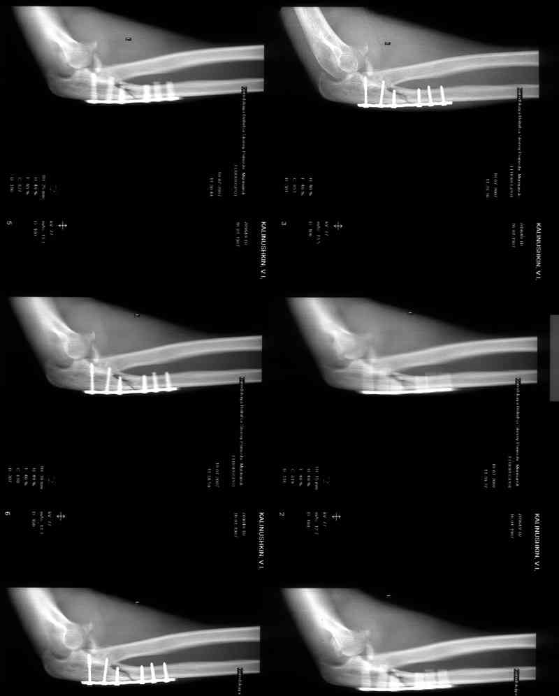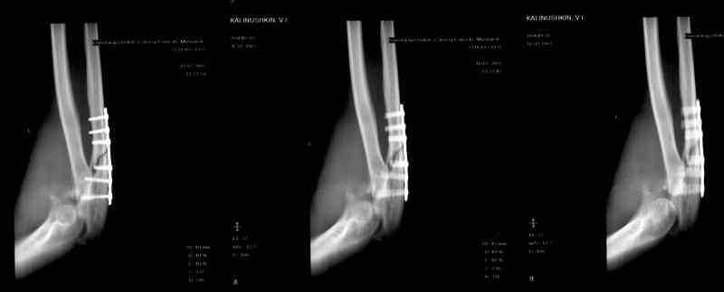 Иммобилизация после операции 3 нед.Через 3 мес. на Rg несращение локтевой, подвывих предплечья кзади, осификаты в обл. венечного отростка.