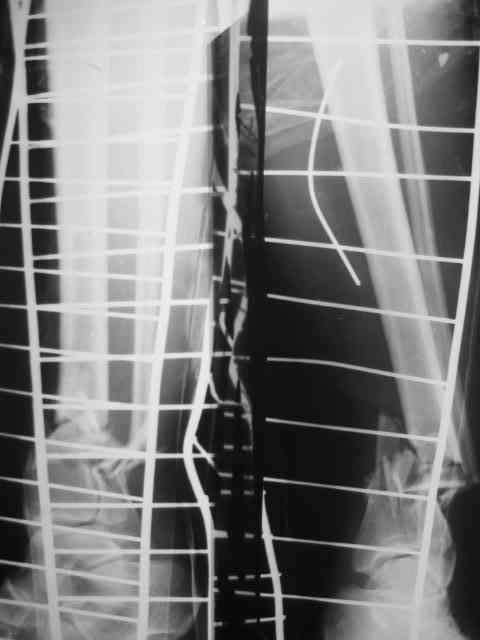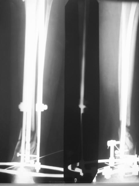 Здравствуйте коллеги!Вышел с отпуска и в палате оказалась данная пациентка. Из истории выяснилось: травма 29.01.07 Диагноз: Открытый оскольчатый перелом н/3 костей голени (якобы 2 Б Каплан), при поступлении операция из трех букв и скелетное вытяжение + остальная терапия. Затем выполнили остеосинтез штифтом (походу Эксперт стоит) видимо хотели зацепится за дистальный отломок, но скорей всего все было нестабильно и накинули этот сокращенный АВФ. На сегодня (162 дня): Больная ходит с ограниченной нагрузкой на конечность (трость). Движения в г/стопе качательные. Трофика мягких тканей не настораживает. Воспаления м/тканей нет.В планах: 1. удаление штифта 2.Наложение стандартного АВФ с фиксацией стопы и устранение всех смещений 3.Резекция нежизнеспособных костных отломков 4.Остеотомия в/3 большеберцовой кости с последующей дистракцией и замещением дефекта.Хотелось бы выслушать мнение по этому случаю!Возможен ли вариант если на опер.столе удастся устранить смещения одномоментной репозицией АВФ и не удалять штифт а производить транспорт большеберцовой кости на штифте? И стоит ли при таком коротком дистальном отломке пытаться блокировать в низу (имеется в виду в АВФ)Спасибо.