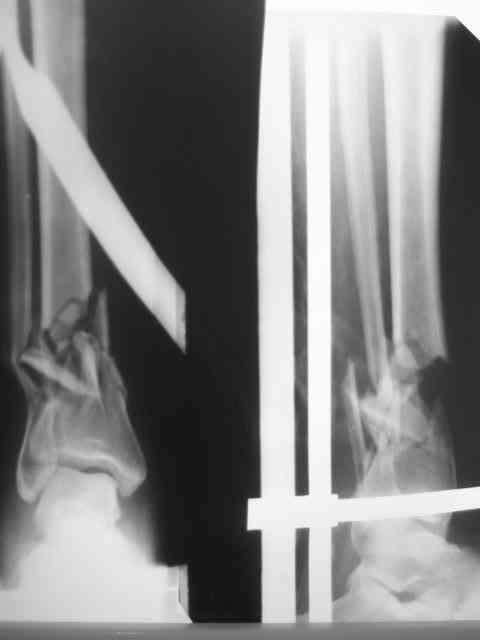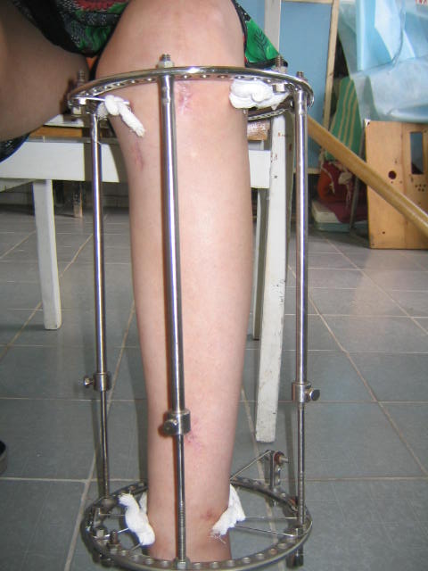 Не вижу необходимости в фиксации стопы. И дистальный отломок tibia достаточно велик, чтобы ввести в него 3-4 спицы с упорами. И голеностопный сустав уже давно пора мобилизовать, дальнейшая фиксация может кончится фиброзным анкилозом.