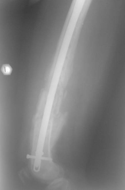 Через 4 месяца стали беспокоить боли и деформация бедра. На снимке угловая деформация AP - варус 11 град.; lateral - 29 град. Объем движений в коленном суставе: ограничение сгибания до 90 град. Локально - патологическая подвижность в нижней трети бедра. Локальная гипертермия, отек мягких тканей. Гиперемии нет. Передвигалась на костылях. В мае 2007 года оперирована в Уральском НИИТО г. Екатеринбурга. Выполнено: полузакрытое удаление пластины и винтов, IM блокируемый остеосинтез.