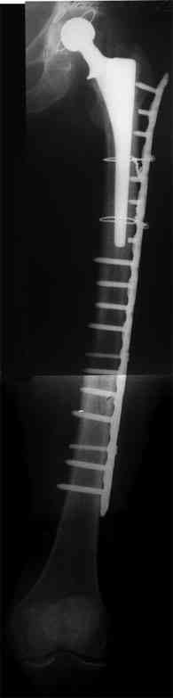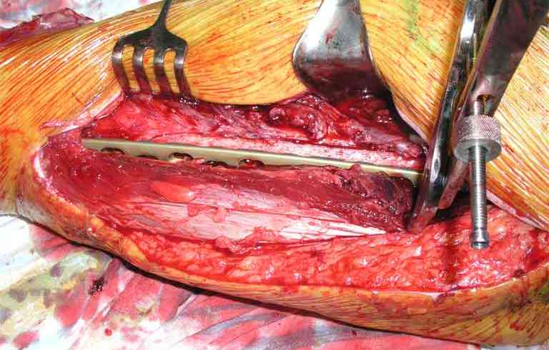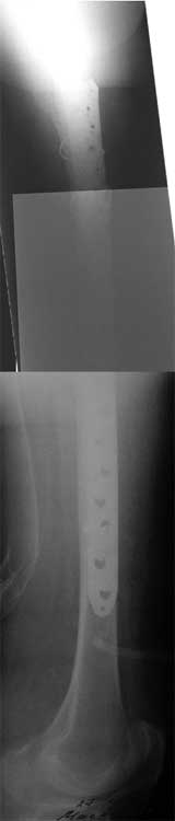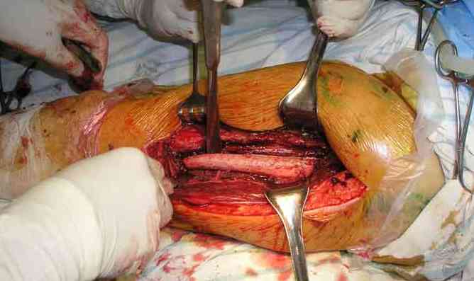 на прошлой неделе прооперировали эту пациентку, рана заживает спокойно, начала ходить с костылями без опоры на поврежденную конечность.