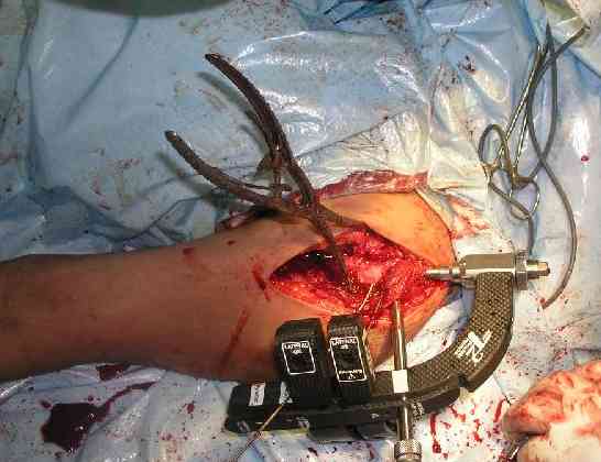 Попытка закрыто изменить положение не удалась. Передним доступом сделали открытую репозицию, гленоид без особенностей. Временно фиксировали спицами и остроконечным костедержателем. Фиксировали гвоздем T2 PHN (Stryker). Для профилактики вывихов после введения проксимальных винтов ротировали дистальный отдел кнаружи на 30