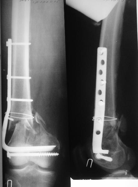 Hello Dear colleagues!!! Here, where it is necessary to recollect main principles of treatment of the fractures!!! This fracture has unacceptable position, therefore requires in rereduction. Ilizarov's Method is a method of a choice in this case. After removing of all hardware I have imposed Hexapod Ilizarov Apparatus, without any changing of the position of fracture on an operational table and without fixation of the knee joint. After operation I recommend gradual distraction followed by translation and correction of angulation. Thus you will receive distraction regenerate. Same it is possible to make by classic Ilizarov Apparatus and Taylor Spatial Frame.