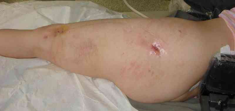 1, 2 - вид бедра на операции (имеется гнойное отделяемое из свища в верхней трети бедра);