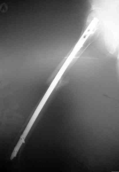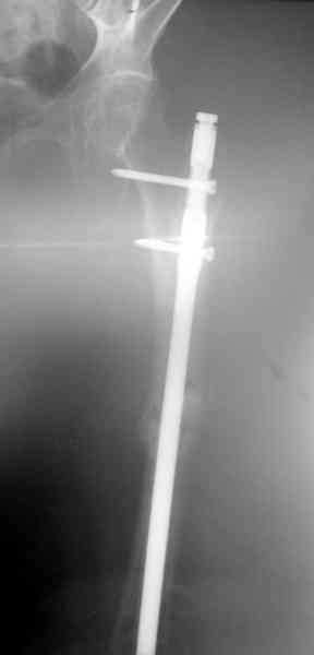В настоящее время наш пациент ( см. http://weborto.net/forum/1177351385/) ходит с одним костылем. У него периодически открывается свищ на задне-наружной поверхности бедра с умеренным серозно-гнойным отделяемым. Температура тела и анализы нормальные. На рентгенограммах имеются признаки консолидации ложного сустава.