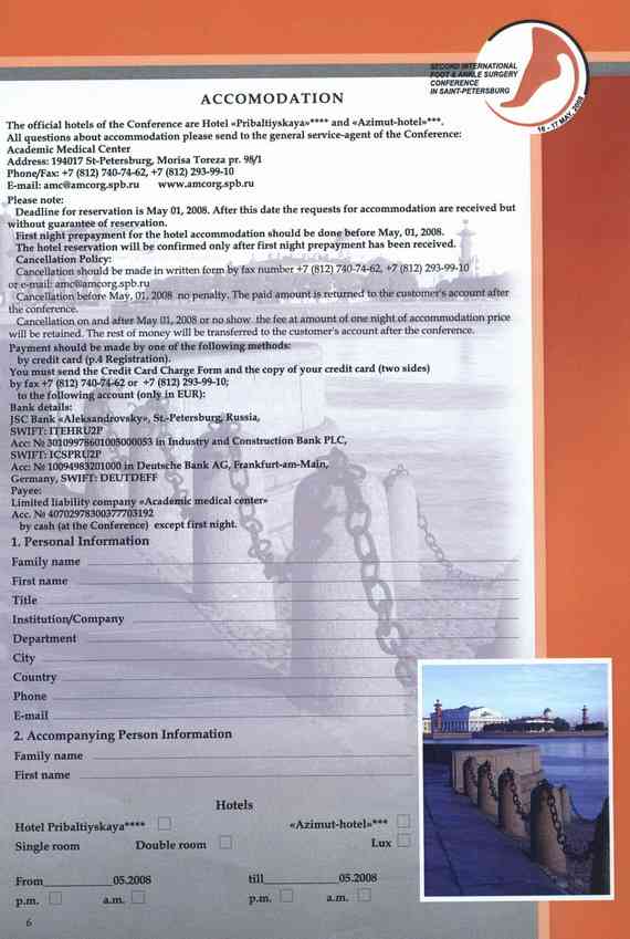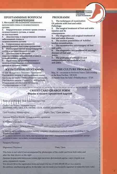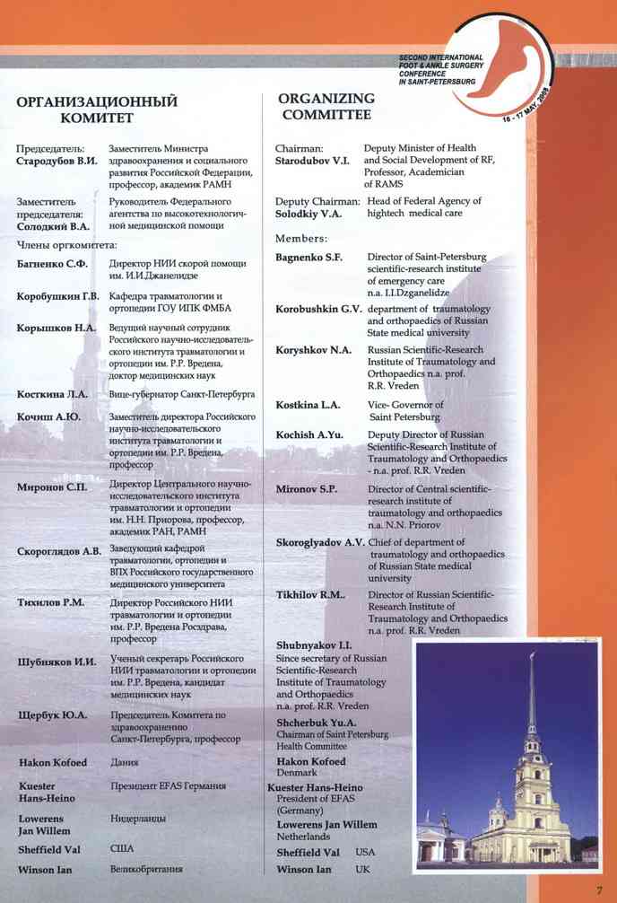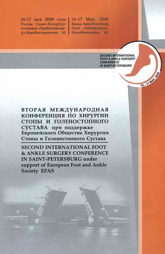 из Уважаемые коллеги! Рад сообщить Вам о том, что в Санкт-Петербурге 16-17 мая 2008 года состоится Вторая международная конференция по хирургии стопы и голеностопного сустава, при поддержке Европейского общества хирургии стопы и голеностопного сустава (EFAS). ПРОГРАММНЫЕ ВОПРОСЫ КОНФЕРЕНЦИИ: 1.Методики обследования пациентов с патологией стопы и голеностопного сустава. 2.Хирургическое лечение травм стопы и голеностопного сустава, а также их последствий. 3.Диагностика и хирургическое лечение заболеваний стопы и голеностопного сустава. 4.Современные возможности реконструкции Ахиллова сухожилия. 5.Реконструктивная микрохирургия стопы и голеностопного сустава. 6.Диагностика и лечение онкологических заболеваний стопы и голеностопного сустава. 7.Проблемы артродезирования и эндопротезирования голеностопного сустава и суставов стопы. Приглашаю принять участие всех желающих в этом интересном мероприятии. Тезисы докладов объемом до двух страниц машинописного текста (1800 знаков, через 1,5 интервала в программе Microsoft Word, шрифт Times New Roman №14), с подписью авторов и визой руководителя учреждения "к печати" будут приниматься до 30 декабря 2007 г. Их можно отправить по электронной почте на адрес footsurgery@mail.ru и продублировать по адресу: 195427 Санкт-Петербург, ул.Акад.Байкова, д.8, ФГУ РНИИТО им.Р.Р.Вредена Росмедтехнологий, организационно-методический отдел. Дополнительная информация в приложении.